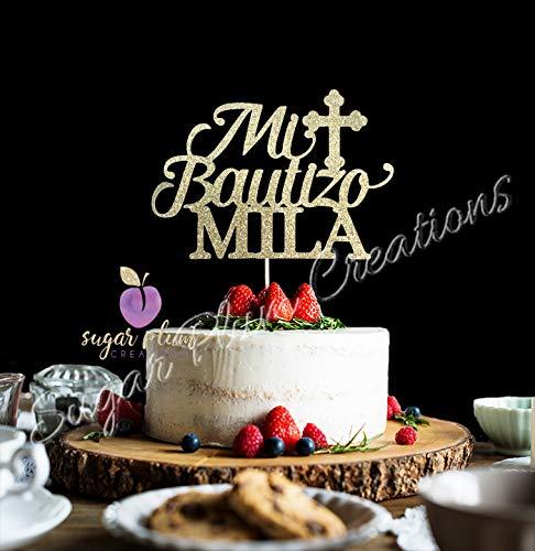Mi Bautizo cake topper is made with Gold Glitter cardstock on one side. The back of the cake topper is WHITE. Material is Glitter Cardstock. Topper measures 6" wide and 5" in height. Attached to one 6 inch stick.